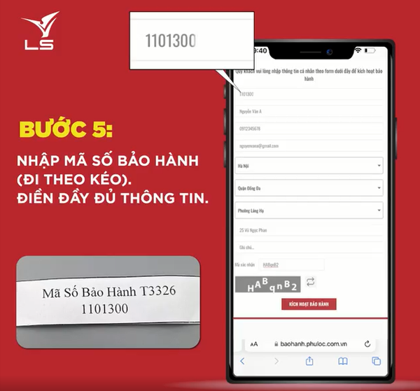 Nhập “MÃ SỐ BẢO HÀNH” và thông tin cá nhân để kích hoạt sản phẩm.