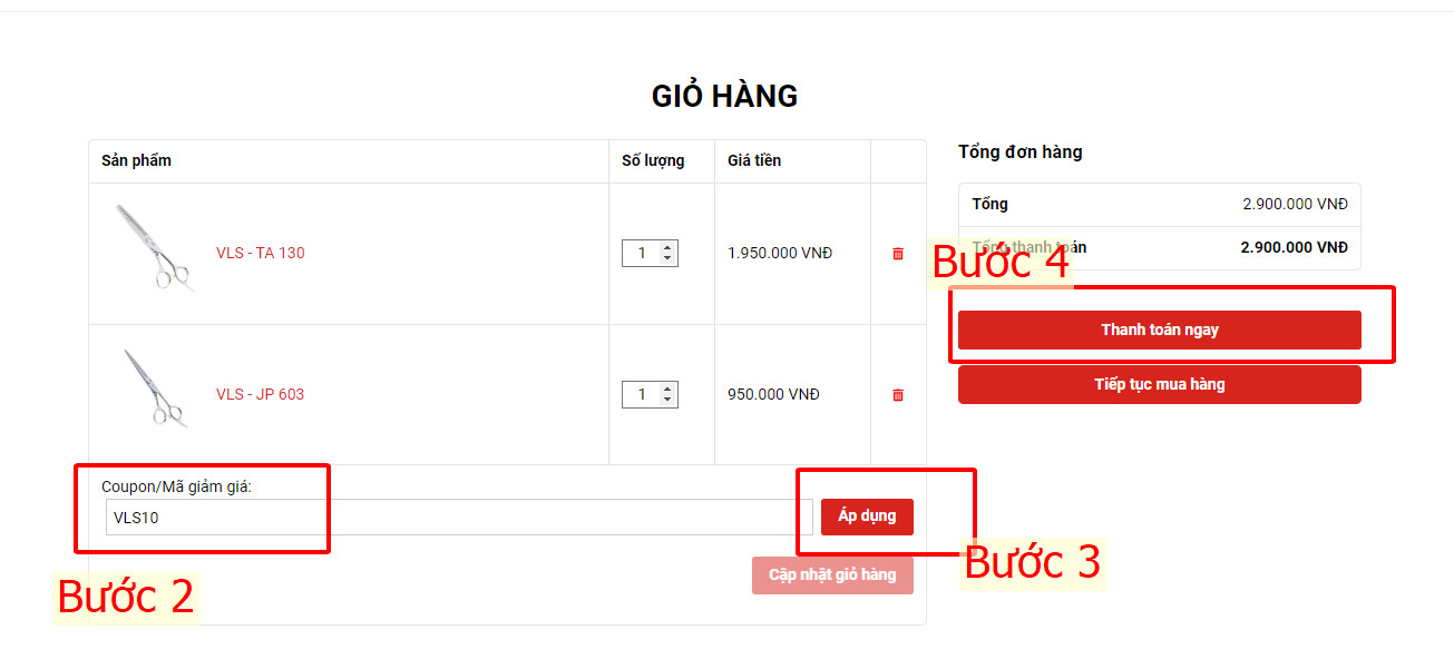 - Bước 3: Nhập mã “VLS10” ở phần “Coupon/Mã giảm giá“